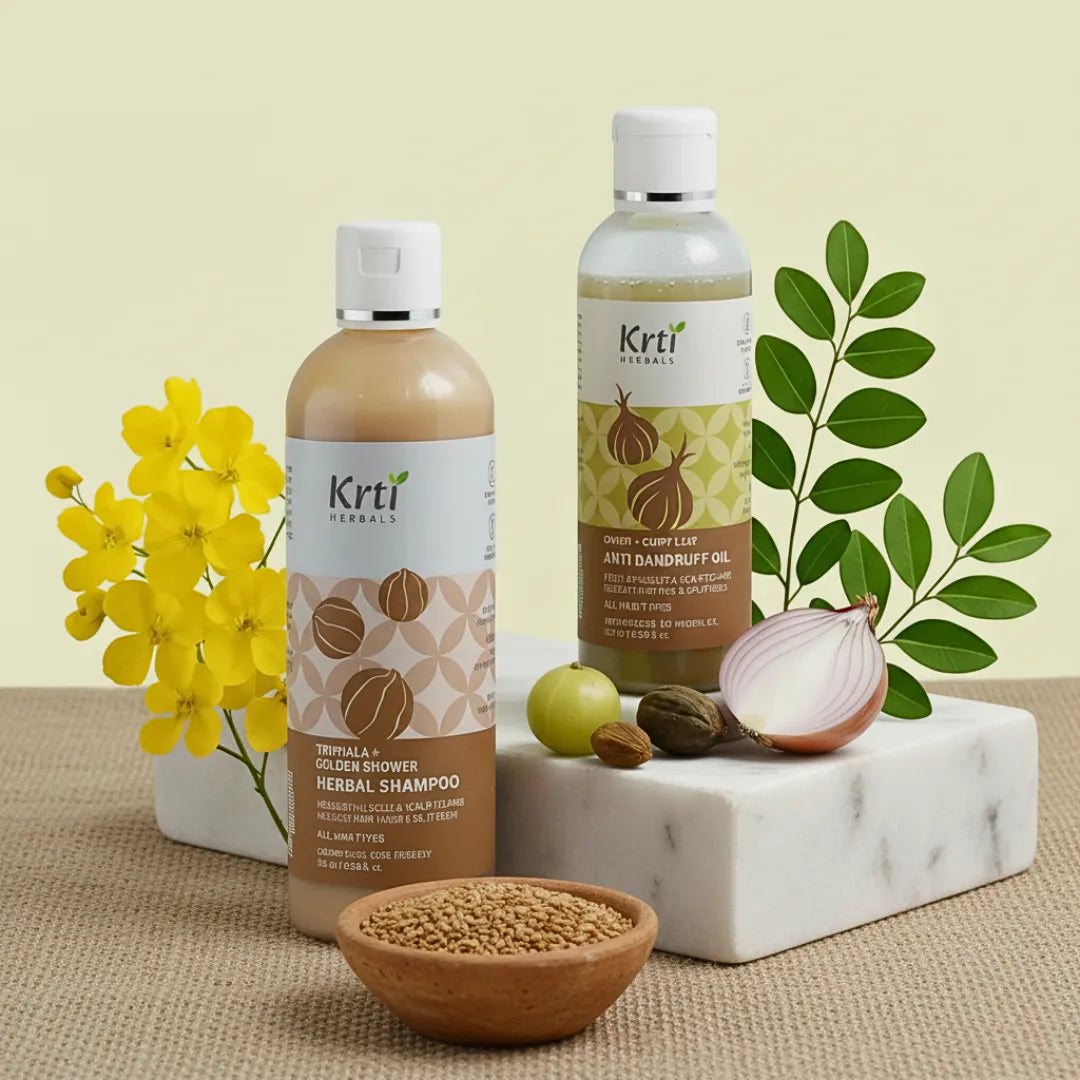 Nourish your scalp and fight dandruff naturally with this Ayurvedic duo. The Anti-Dandruff Oil soothes irritation and clears flakes, while the Triphala Herbal Shampoo strengthens roots, balances scalp health, and leaves hair soft, shiny, and refreshed.