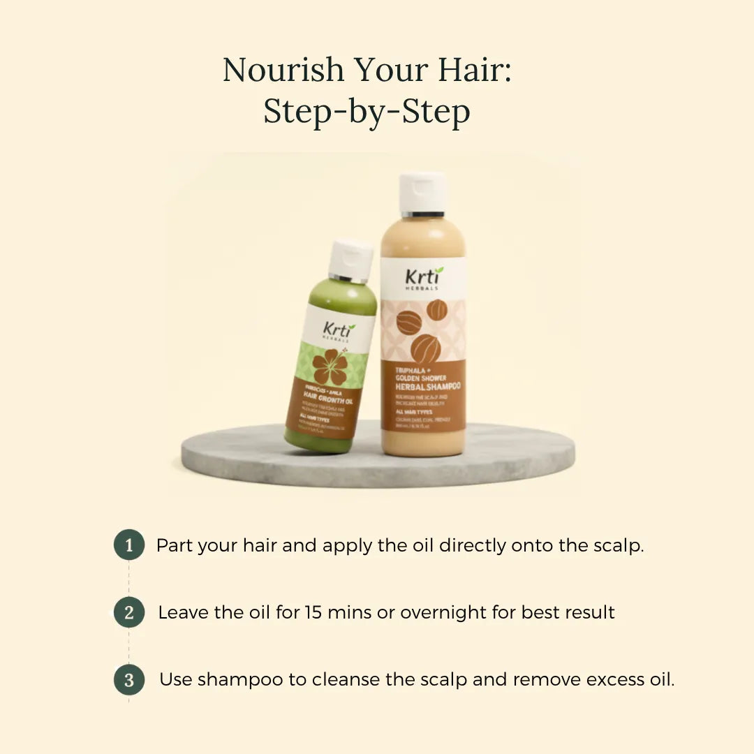 Key benefits of Krti Herbals Hair Growth Oil – reduce hair fall, promote hair growth and Triphala Herbal Shampoo – cleanses scalp, supports hair growth, and reduces hair fall Key benefits of Krti Herbals Hair Growth Oil – reduce hair fall, promote hair growth and Triphala Herbal Shampoo – cleanses scalp, supports hair growth, and reduces hair fall